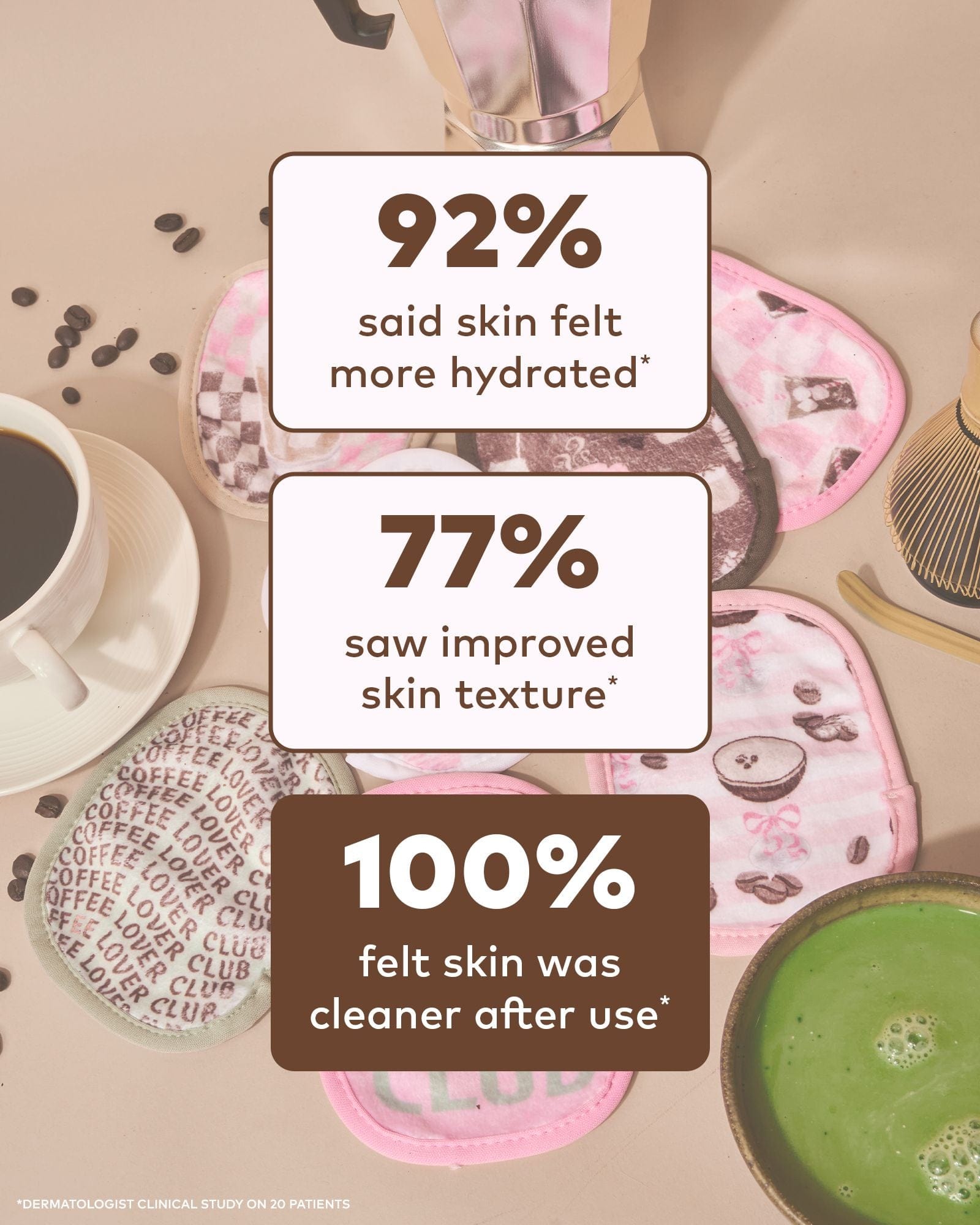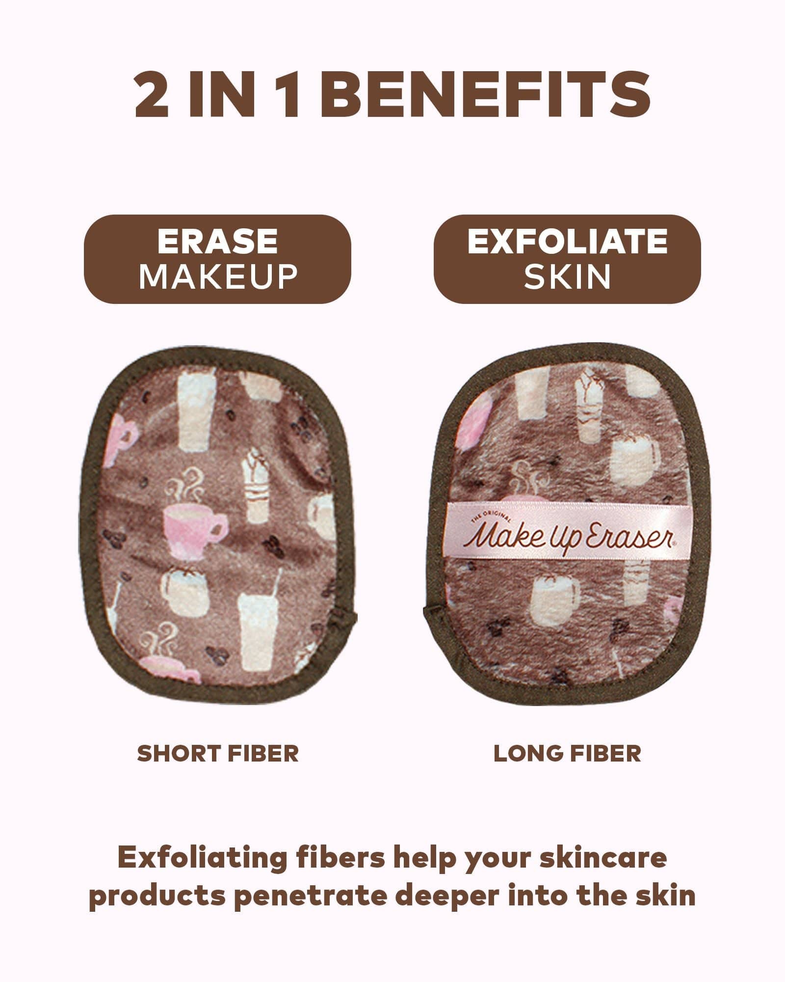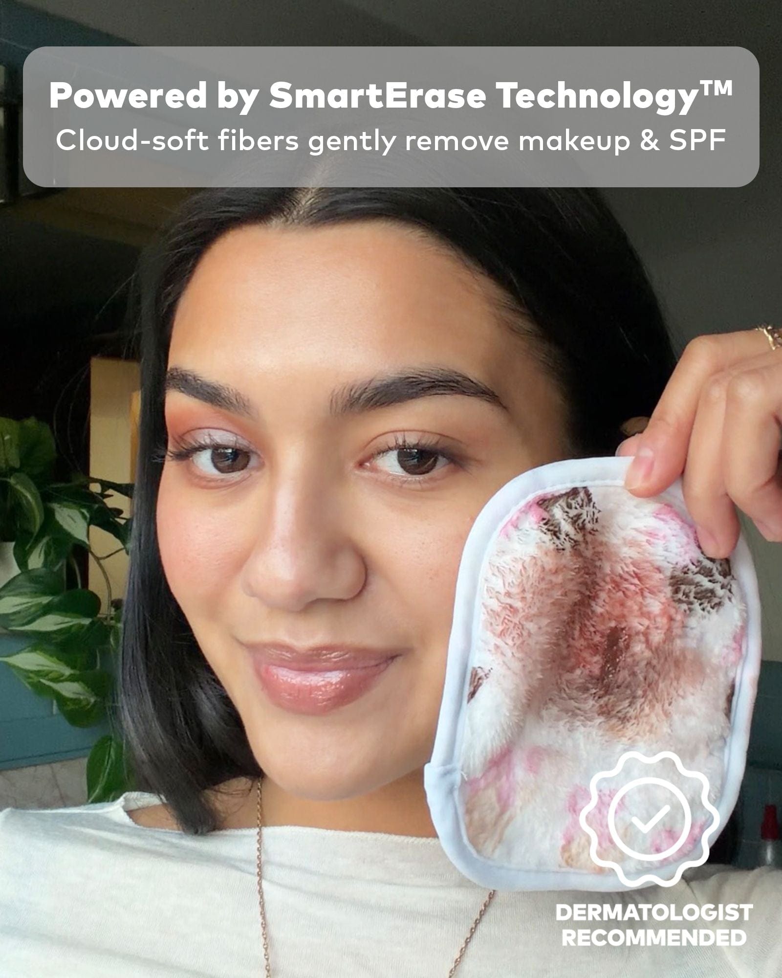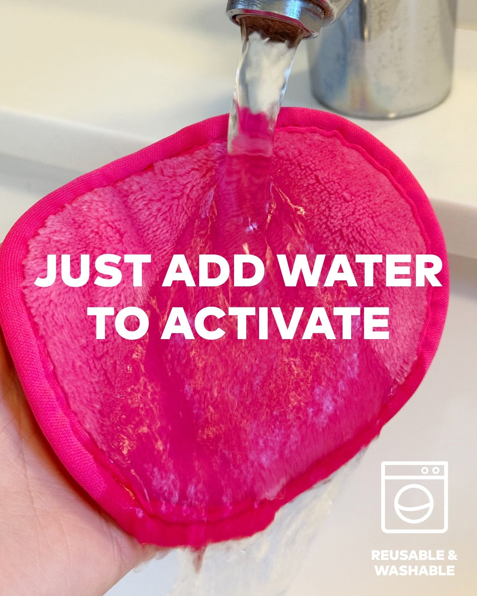 Erase all makeup with JUST WATER™ including waterproof. Our patented, water-activated, cloud-soft fibers gently & easily remove all makeup & sunscreen from pores. 2 in 1 benefit: one side erases makeup & one side exfoliates skin.